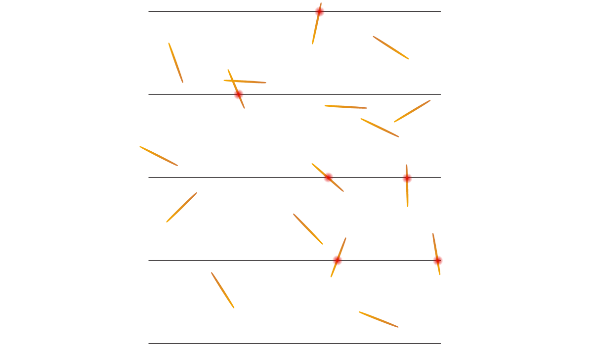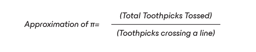 Try this experiment outdoors! Use chalk or painter’s tape to draw wide parallel lines on pavement. Replace toothpicks with popsicle sticks, chopsticks, or even pencils for a larger, visible version. Lines must be twice as far apart as the length of the stick. (Example: if pencils are 6 inches long, space lines 14 inches apart.)